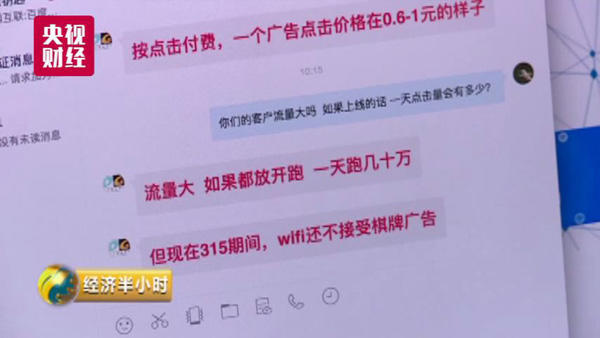 随后记者详细询问,如果一款可以提现金的棋牌类手机游戏,推广的话是什么价格。这位代理商告诉记者,按照点击量来付费,一个广告的点击价格在0.6元到一元。他声称,Wi-Fi万能钥匙客户流量很大,放开跑,一天能有几十万的点击量。但马上他又很警惕地告诉记者,315期间Wi-Fi万能钥匙不接受棋牌类广告,因为风险管控,棋牌类容易出现赌博。