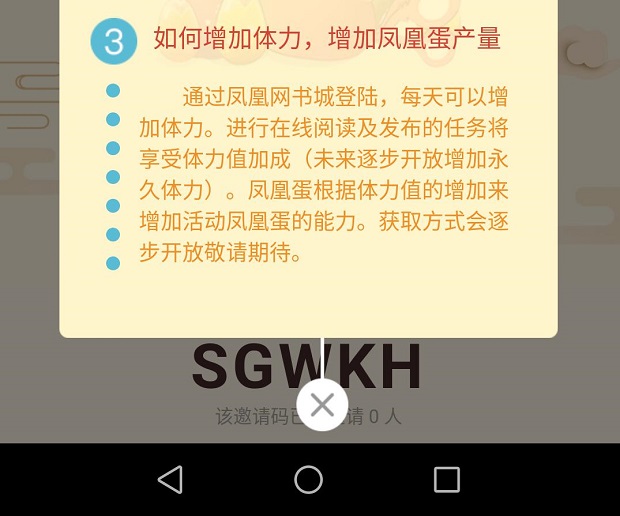 通过登陆凤凰网书城,每天可以增加体力。进行在线阅读及发布的任务更能享受体力值加成(未来逐步开放增加永久体力)。凤凰蛋将根据体力值的增加来增加活动凤凰蛋的能力。