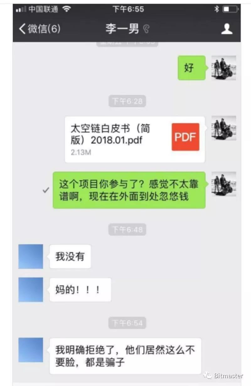 一位通过代投参与了私募的X先生称,“去年年底,在(币圈)群里有人发太空链ICO的消息,我看有帅初,李笑来大佬站台,微博薛蛮子也支持了,虽然看得出来是圈钱项目,但觉得还是能搞下短线,投下赚点就跑。”