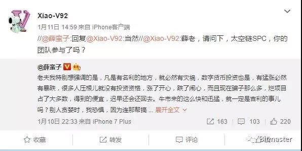 但是在1月11日有用户在微博上咨询薛蛮子是否参与了太空链的时候,薛蛮子明确回复“当然”。