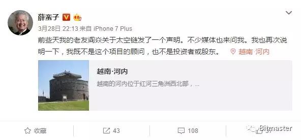 昨晚薛蛮子发微博声称自己既不是太空链的顾问,也不是投资者或股东。
