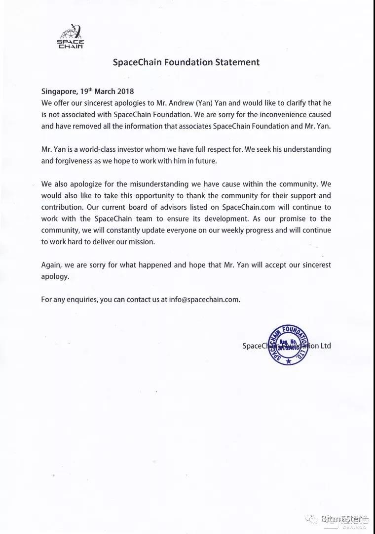 太空链项目方也在3月19日声明公开向阎森道歉,承认阎焱与该项目并无关系,称已经删除将项目方和阎焱联系在一起的相关信息,为由此造成的不便和误解致歉。