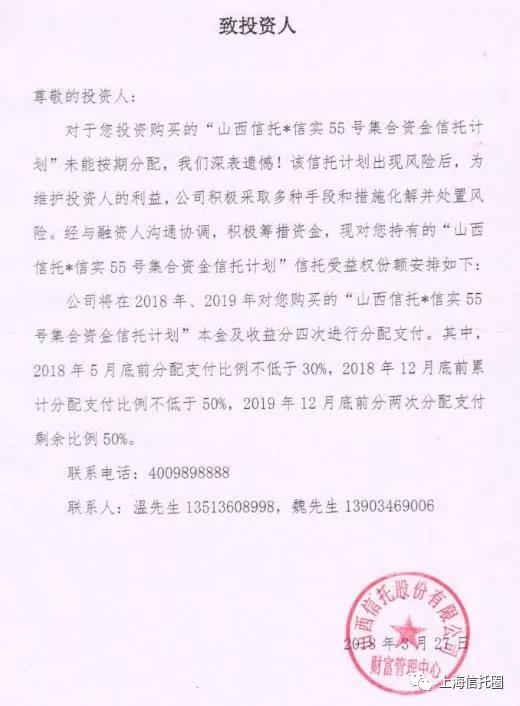 3月27日,山西信托针对上述三款信托产品发布了类似的“致投资人”信,对相关产品未按期分配表示遗憾。