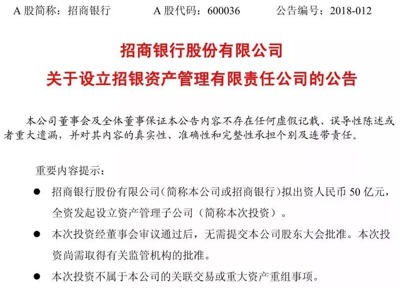 网络整理 2021-03-22 17:283月23日,招商银行公告拟出资50亿元,全资发起设立资产管理子公司“招银资产管理有限责任公司”。
