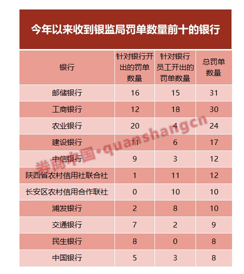 从银监局今年以来开出的罚单来看,有2家银行今年以来已经收到超过30张罚单,分别是邮储银行和工商银行。邮储银行收到的罚单最多,为31张,其次是工商银行30张。此外,还有6家银行收到银监局罚单超过10张。农业银行收到24张罚单,建设银行收到17张罚单,中信银行和陕西省农村信用社联合社各收到12张罚单,浦发银行和长安区农村信用合作联社各收到10张罚单。