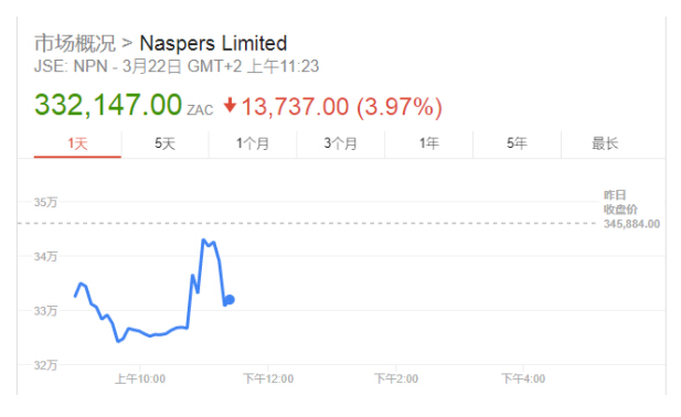 截至发稿,Naspers在南非交易的股票下跌3.97%。