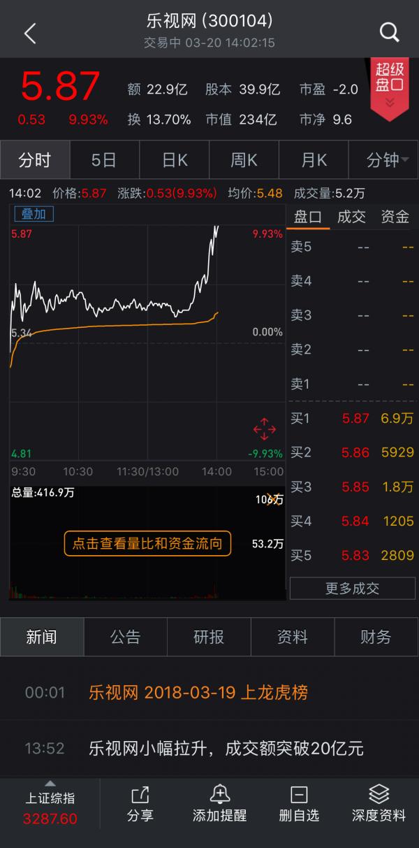 3月20日,乐视网(300104)开盘翻红,在下午2时左右突然拉升,直奔涨停,虽然随后股价出现了回落,但临近收盘,乐视网再度封上涨停板(涨幅9.93%),股价报收于5.87元/股。