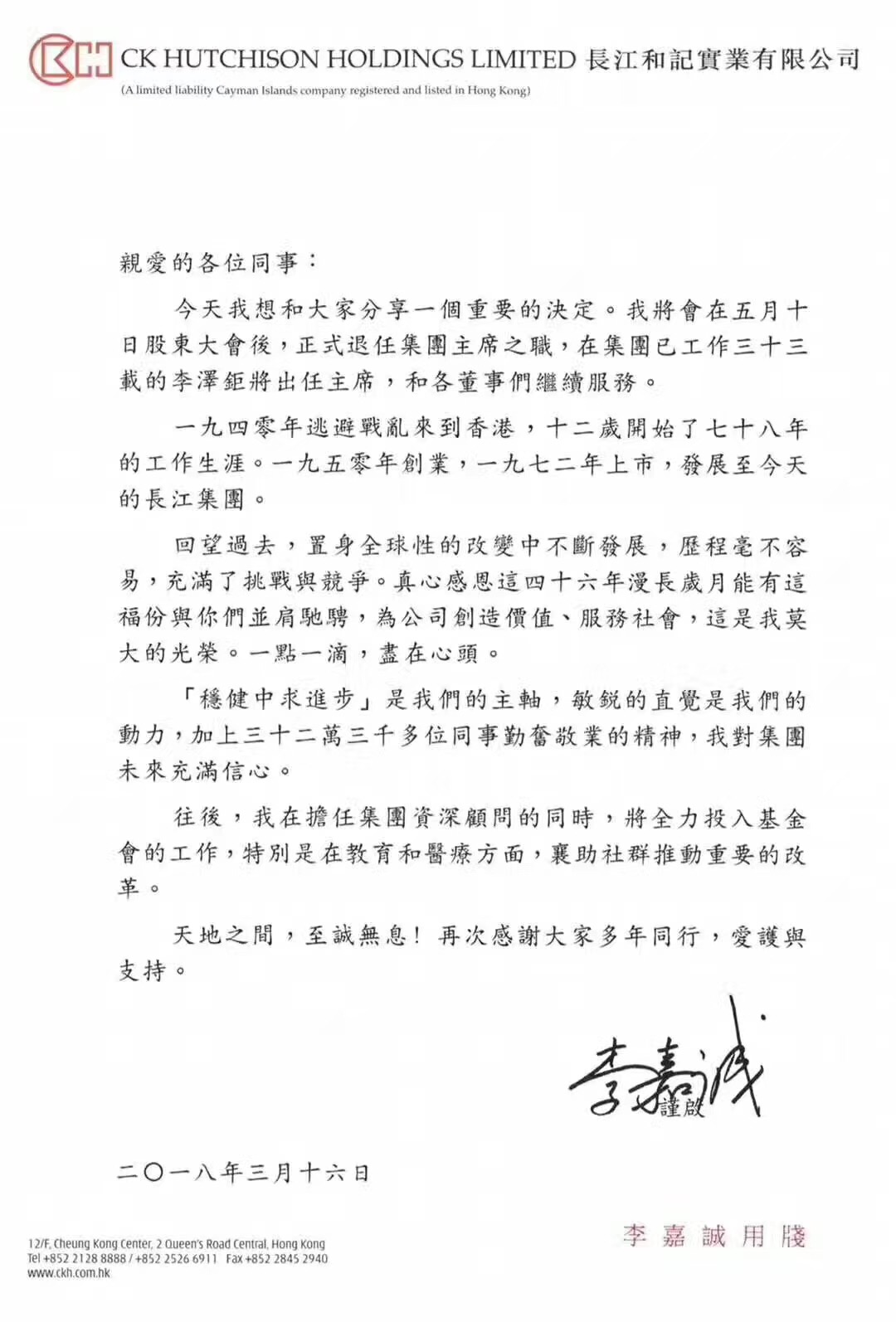 3月16日下午,长江和记实业有限公司公告称,董事会宣布,李嘉诚将于2018年5月10日举行之本公司股东周年大会结束后,退任本公司主席、执行董事及薪酬委员会成员之职务。