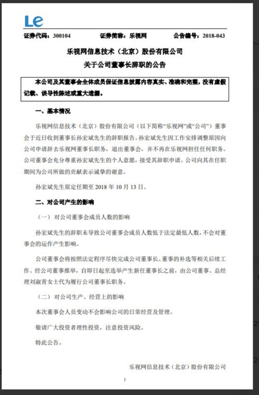转载请标注:信息网——“超级接盘侠”孙宏斌辞去乐视董事长职务!