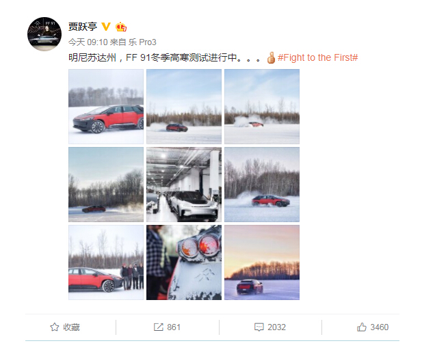 据贾跃亭介绍,这是FF91在位于美国的明尼苏达州,进行冬季高寒测试。