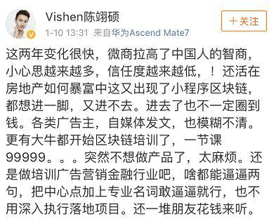 微博网友王者flyer吐槽道:区块链到底是什么?也许朋友圈里真正理解的人寥寥无几,但这不妨碍你他们为获得各种区块链只是迫切得付费入群、购买学习课程。各种蹭热度建立的冒牌大佬群、随便网上搜罗文章合成的所谓学习资料包也应运而生,据说还有微商培训界的人士开始进军区块链培训。