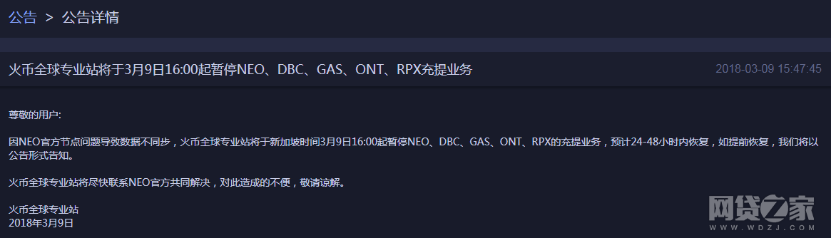 网络整理 2021-03-22 17:39网贷之家综合 3月9日下午,数字货币交易平台火币全球专业站发布公告称,将于今天(3月9日)16点起暂停NEO、DBC、GAS、ONT、RPX充提业务,原因是NEO官方节点问题导致数据不同步,预计24-48小时内恢复。