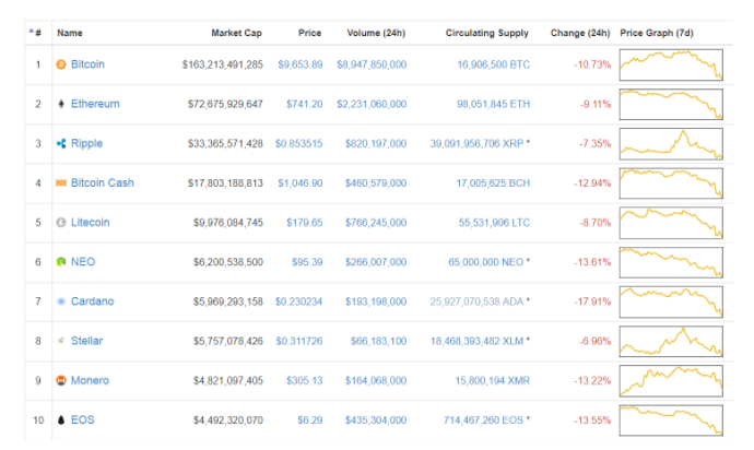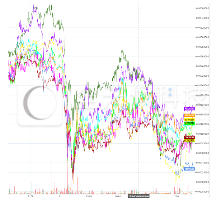 CoinMarketCap.com的数据显示,8日凌晨,排名前十的数字货币全线暴跌,24小时内跌幅均超6%。