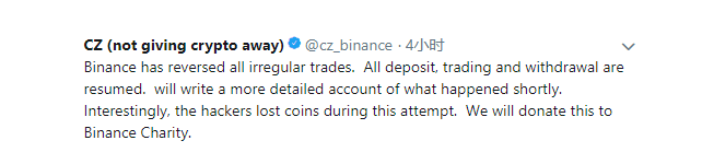 币安创始人赵长鹏也于8日凌晨在其个人推特上表示:“币安上所有异常交易已完成回滚处理。充值、交易和提现均已恢复。将会对今日凌晨所发生的事情进行更详细的说明。有趣的是,黑客在此次攻击中损失了货币。我们将把这些币捐给币安慈善。”
