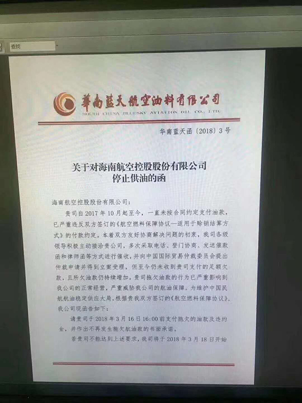 澎湃新闻记者看到,在一份《关于对海南航空控股股份有限公司停止供油的函》上,华南蓝天航油公司表示,“贵司自2017年10月起至今,一直未按合同约定支付油款,已严重违反双方签订的《航空燃料保障协议-适用于赊销结算方式》的付款约定。本着双方友好协商解决问题的初衷,我司各级领导积极主动接洽贵公司,多次采取电话、登门协商、发送催款函和律师函等方式进行催收,并向中国国际贸易仲裁委员会提出仲裁申请并得到立案受理,但至今仍未收到贵司支付的足额欠款,且所欠油款仍持续增加。贵司拖欠油款的行为已严重影响到我公司的正常运营,严重威胁我公司的航油保障。”