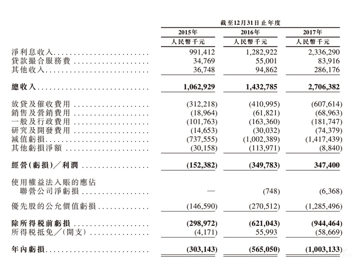 2015年、2016年、2017年,维信金科分别实现营收10.6亿元、14.3亿元、27.1亿元,复合增长率59.6%。利润方面,分别亏损净额3亿元、5.7亿元和10亿元。