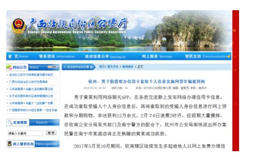 网络整理 2021-03-22 17:443月1日,广西壮族自治区公安厅官网发布警情通报,钦州一男子假借帮办信用卡套取个人信息实施网贷诈骗被刑拘。
