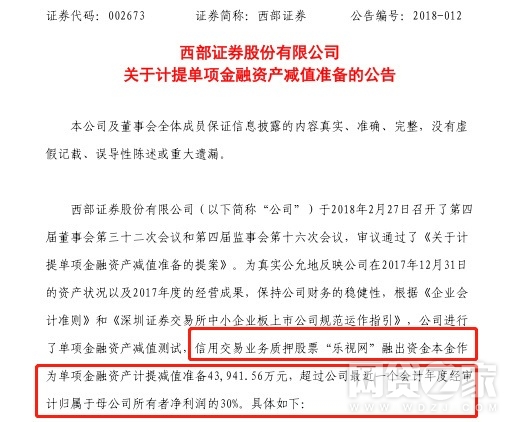 另据2月28日西部证券公告,贾跃亭等人质押的乐视网股票爆仓给西部证券造成了大量损失,其资产计提减值准备43,941.56万元,超过公司最近一年度净利润的30%。换句话说,仅乐视网质押股票融资一项就抹平了西部证券一年的三成利润。