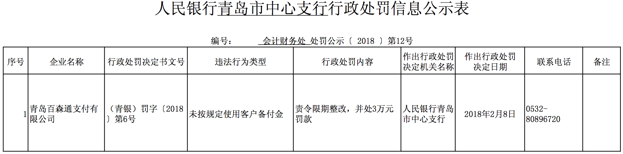青岛百森通支付有限公司(下称 “百森通”)因未按规定使用客户备付金被人民银行青岛中心支行处以责令限期整改,并处3万元罚款。作出处罚的决定日期是2018年2月8日。百森通旗下运营预付卡消费卡“佰通卡”,公司成立于1999年,注册资金3000万元人民币,官网介绍其预付卡,可缴纳水、电、燃气、手机、固话、有线电视等各项日常费用,更可在商超、百货 、餐饮美食、娱乐休闲、汽车服务、加油站等场所畅通消费。