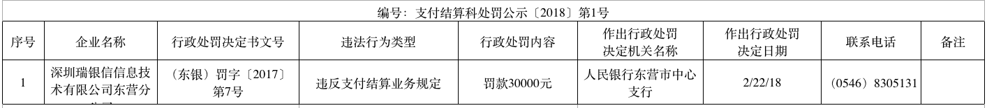 网络整理 2021-03-22 17:482018年,央行再开多张支付罚单,深圳瑞银信信息技术有限公司(下称 “瑞银信”)东营分公司因违反支付结算业务规定被人民银行东营市中心支行处罚罚款3万元。作出处罚的决定日期是2018年2月22日。