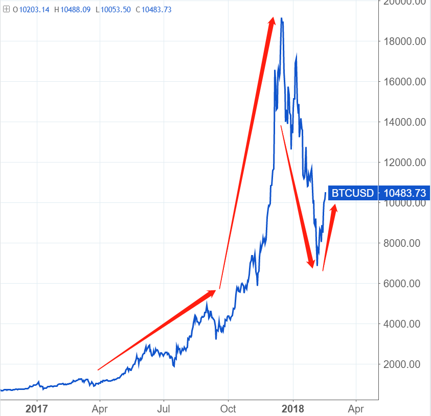 不过在中国农历春节当周(2月12-16日),比特币迎来反弹,目前再次站上10000美元整数关口,较阶段性低点回涨逾60%。