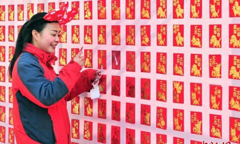 2月16日,大年初一,游客来到天津方特欢乐世界红包墙前抢包红。