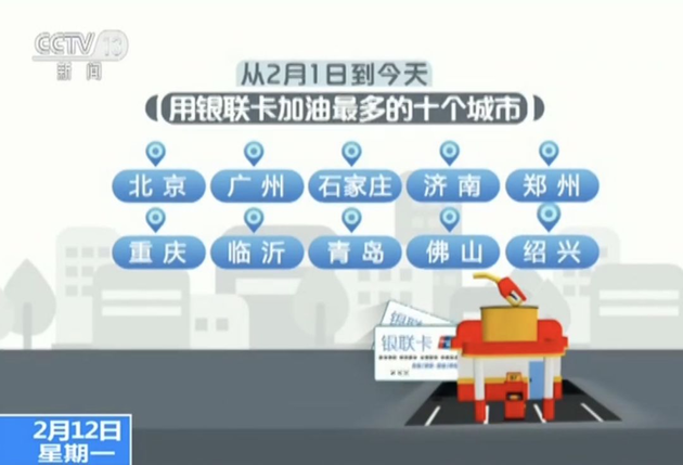 从2月1日到12 日,用银联卡加油最多的十个城市依次是北京、广州、石家庄、济南、郑州、重庆、临沂、青岛、佛山和绍兴。