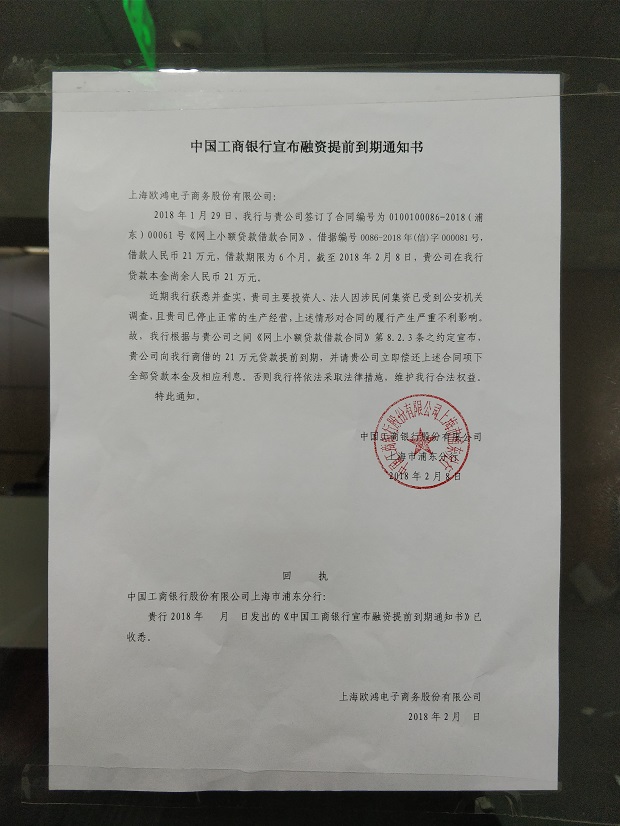 网络整理 2021-03-22 17:52读者向蓝鲸财经爆料,工商银行在上海欧鸿电子商务股份有限公司(下简称“鸿欧电商”)的总部门口贴了融资提前到期通知书。通知书中称,欧鸿电商于1月29日向工商银行借款21万,期限6个月。因为鸿欧电商的法人因涉民间集资受公安机关调查,且鸿欧电商已停止经营,工商银行宣布鸿欧电商贷款提前到期。