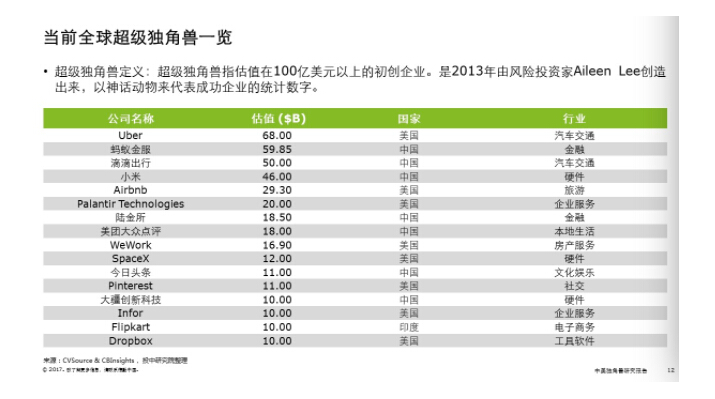 而据德勤与投中信息联合发布的《中美独角兽研究报告》,截至2017年6月底,全球共有252家非上市公司的估值大于10亿美元,估值累计总额达到8795亿美元。其中,排名第一的是全球网约车巨头——Uber,估值达680亿美元。蚂蚁金服紧随其后,估值近600亿美元。名列第三的是中国网约车巨头滴滴出行,估值为500亿美元。