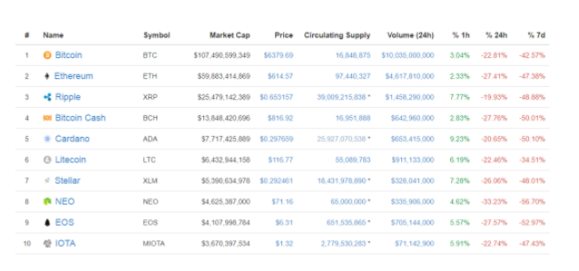 市值前十的数字货币无一幸免,在过去7个交易日中几乎全部市值减半。