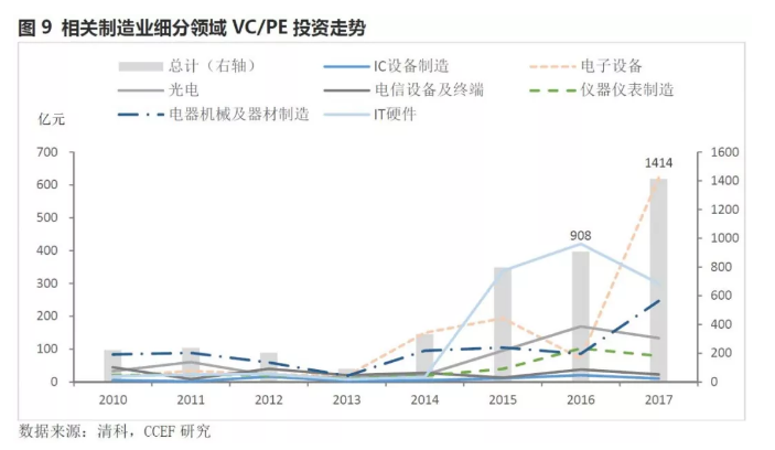 2017年信息科技相关的制造业风投总额达到1400亿元,同比增长56%。从风投资金流入的各细分领域看,电子设备、电器机械及器材制造的增长最为明显。物联网终端的IC芯片制造、人工智能的IT核心硬件及场景应用的电子机械设备制造、云计算的网络基础通信制造等直接相关的制造产业,都将随同信息科技的快速发展,不断转型升级并将迎来快速发展。