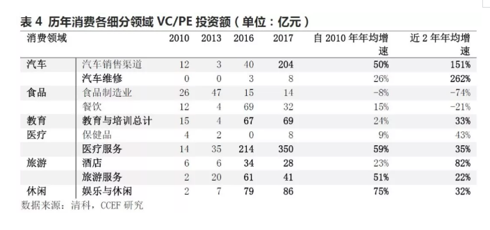 近年来消费升级的相关细分领域风投金额变化也体现出这一特点,其中休闲、医疗服务、旅游服务、汽车销售渠道四个领域风投额自2010年起年均增速均在50%以上,近两年尤其是汽车消费领域、酒店旅游消费领域的风投资金流入增速最大,其增速分别为151%、82%,此外,教育与培训领域也呈现流入加速趋势。