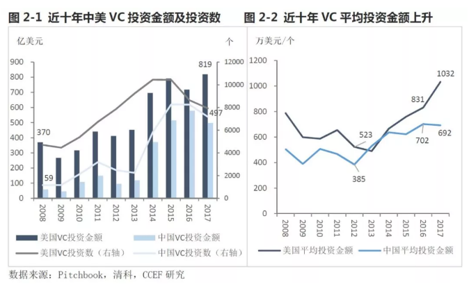 中美风投总额近十年均呈现上升趋势,2017年中、美VC投资总额分别为819、497亿美元,然而投资企业数相比2015年顶峰分别下降了24%、13%,单个企业(项目)平均投资金额持续上升,当前美国VC对单个企业的平均投资金额已超1000万美元,中国也已达到月700万美元的水平。