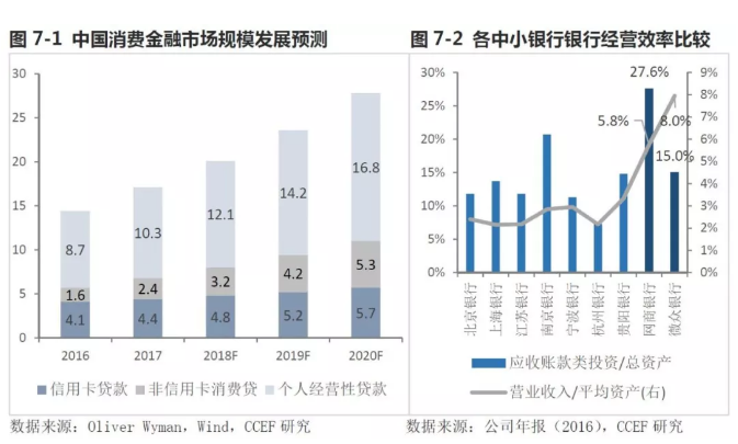 当前,中国的金融深化方兴未艾,人均消费增长带来的个人消费金融市场规模的迅速扩张,假设个人消费金融市场规模未来3年以将18%年均增速增长,至2020年将达到17.8万亿元的规模。事实上,以微众银行微粒贷、互联网金融平台消费贷为代表的个人贷服务目前均呈现加剧抢占市场的趋势。与此同时,服务实体企业的供应链金融在大数据时代也呈现出勃勃生机,银行及金融服务平台通过供应链的不同节点提供封闭授信及其他结算、理财等综合金融服务,针对商户的POS贷、网商贷等金融服务均数此类。