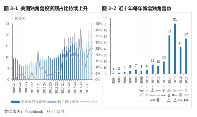 风投资金集中的原因在于独角兽投资规模的持续扩大,自2014年至今四年间全球年平均新增独角兽企业数61家,为2014年之前四年年均增量的4.5倍,2017年美国独角兽投资占VC比例约为30%。2017年全球有57家初创企业取得独角兽称号,估值总额达1165亿美元,中美独角兽估值总额分别为546亿、487亿,中国新增独角兽估值已超越美国。值得注意的是,中美新增独角兽企业约66%均来自于软件/互联网和生物/医疗产业,可以说,在风投资金集中并继续催生大量独角兽的趋势下,由于软件/互联网、生物/医疗产业市场想象空间大,未来可能被中美资本市场赋予更高估值,成为风投资金获取高额资本回报的基础。
