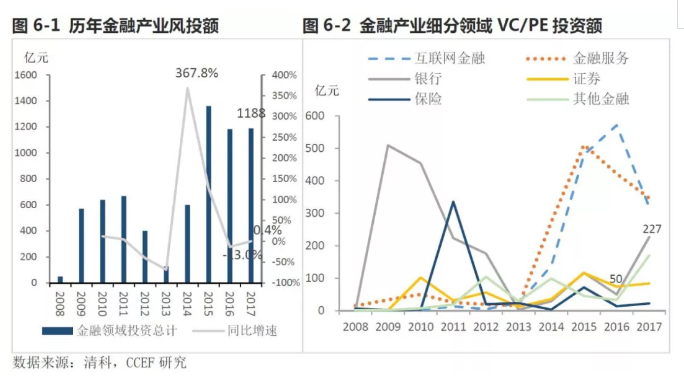 随着监管强化和金融去杠杆政策的落实,中国金融业的野蛮生长时代已经结束。自2013年起以互联网金融、金融服务带动起的金风投热潮也相应出现明显回落,同比增速由2014年的368%回落至零增长。从细分领域上看,“互联网金融”、“金融服务”领域2017年风投流入金额分别为318亿、347亿,相比前两年的高点已分别下降44.3%、32.1%,可见以监管套利为催生素的所谓“互联网金融”和“金融服务”已被风投资金所逐渐冷落。