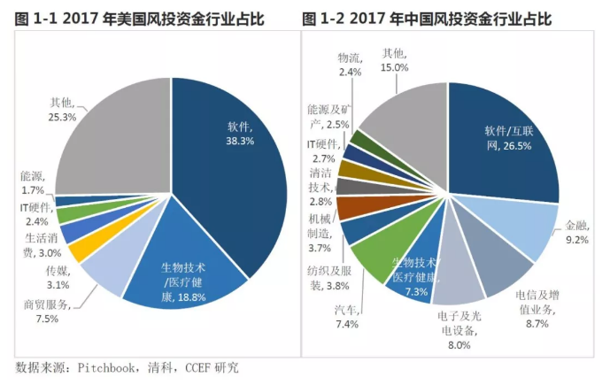 1、中美产业投资在结构上愈来愈趋同。软件/互联网和生物/医疗产业作为热点产业将被中美资本市场赋予更高估值,2018年依旧是中国风投资金持续流入的热点。