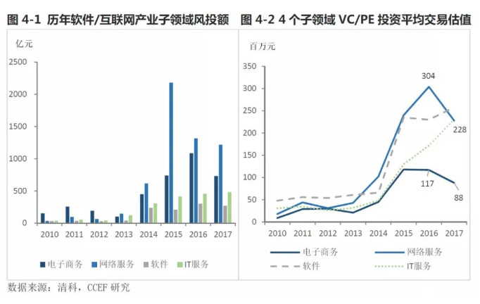 2017年,在第一大风投热点的软件/互联网产业中,电子商务、网络服务和软件技术、IT服务这四个领域的VC/PE流入资金分别为731、1217、269、482亿元,其中电子商务、网络服务领域的资金流入分别自前两年的流入顶峰回落33%、44%,同时平均交易估值也相应下降25%左右。从中国新增高估值企业的分布看,电子商务、网络服务的企业占比67%,这类企业更多凭借国内广阔的市场空间、庞大的互联网用户基数取得高估值,未来在各服务细分领域被不断开拓的情况下,国内电子商务、网络服务企业将面临更加激烈的竞争,市场也将从过去五年的爆发式增长回归理性,风投资金流入量持续走低与平均交易估值的下降正是反应出这一趋势。