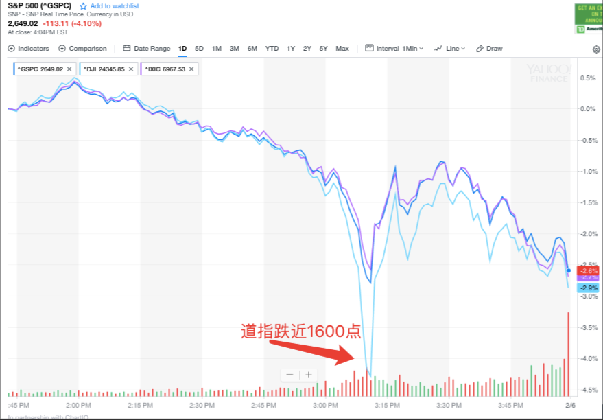 美股遭遇黑色星期一。道指盘中一度跌近1600点,创下史上最大盘中点数跌幅。标普创2011年8月份以来最大单日跌幅,收跌4.1%,回吐年内全部涨幅。