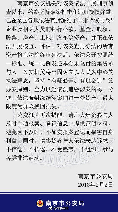 (网贷之家提示:1月30日,南京市公安局官网开通了"钱宝网用户配合调查取证受理登记平台",供受害投资人报案、登记信息,可点击【详情】跳转至该登记平台页面)
