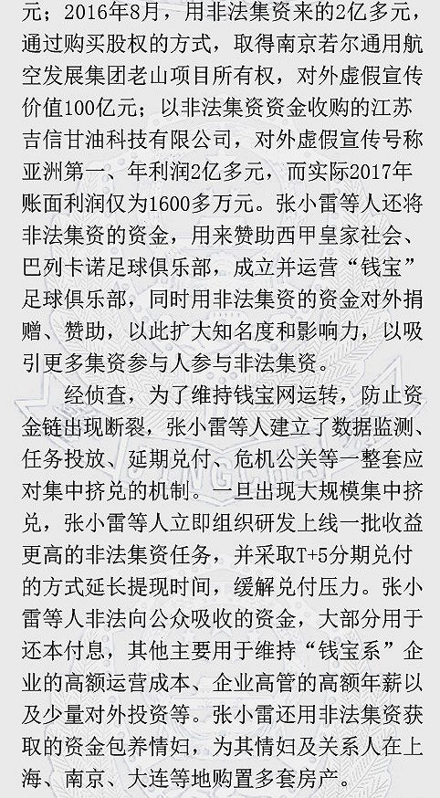 经公安机关侦查,2012年以来,张小雷等人依托钱宝网网络平台,以完成广告任务可获取年化收益率达40%至60%的高息为诱饵,向社会公众吸收巨额资金,涉嫌犯罪。