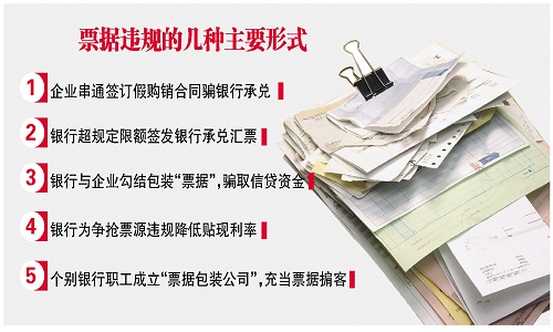 有业内人士总结了回应票据违规的几种主要形式和原因,包括企业相互串通签订假购销合同骗取银行承兑,或集团企业通过关联企业、关联交易套取银行信贷资金;银行本身盲目扩张业务,放松审查,甚至放大信用,超规定限额签发银行承兑汇票;银行与企业勾结,联手包装“票据”,利用假银行承兑汇票骗取银行信贷资金;银行在经营票据贴现业务过程中,为争抢票源违规降低贴现利率;个别银行职工利用工作之便,以自已或其亲属名义成立“票据包装公司”,充当票据掮客等。