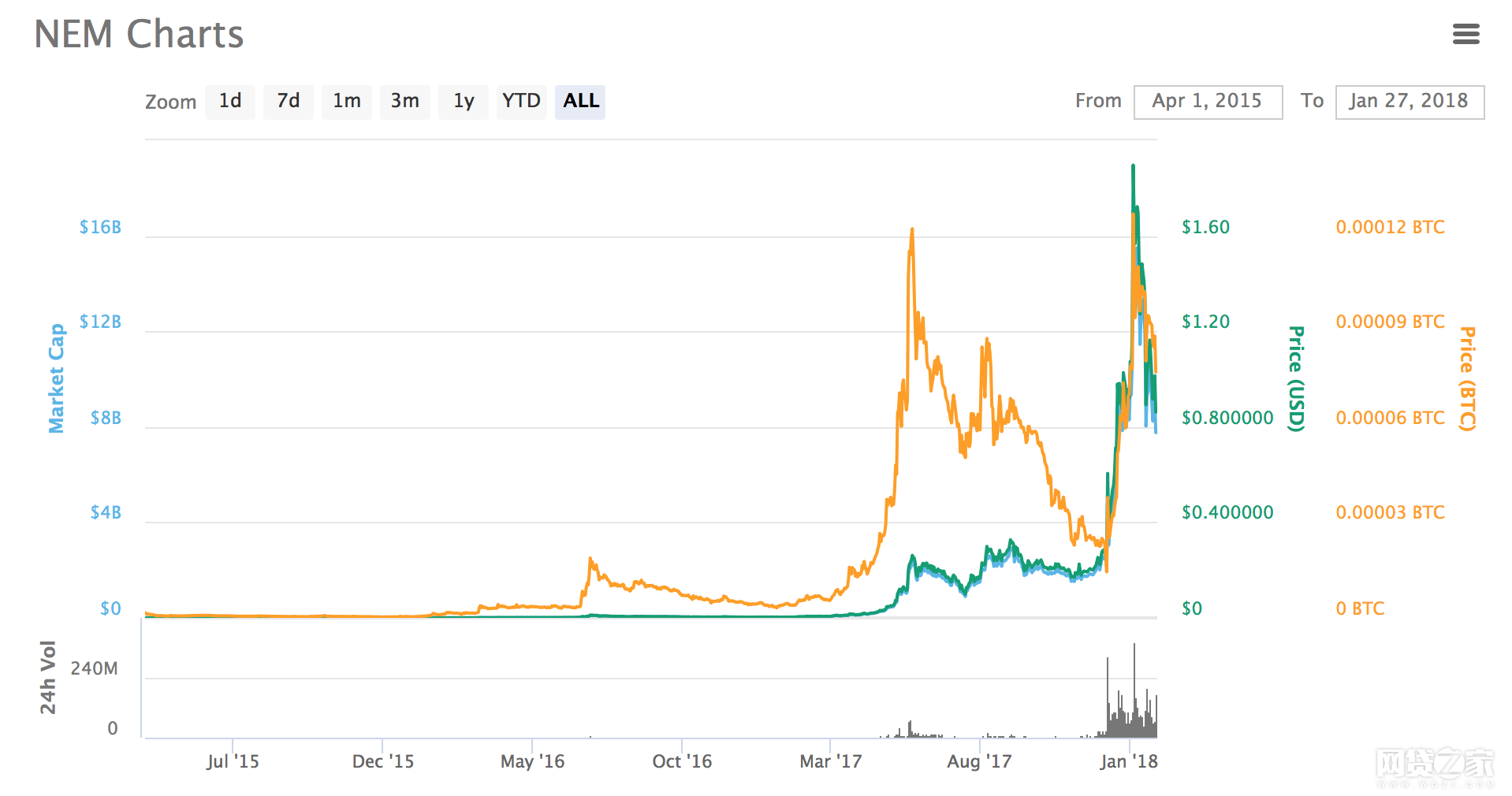 NEM代币全称为NewEconomyMovement(新经币),创始于2014年1月19日,CoinMarketCap显示其市值目前位列全球第十,截止发稿时间,NEM价格为0.86美元,24小时内下跌超过11%。