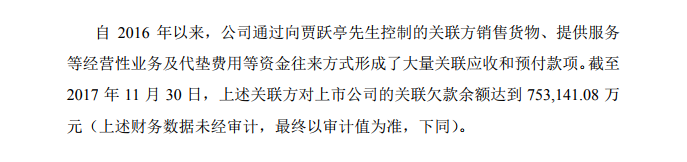 此前,乐视网于1月19日晚间发布《关于公司股票的风险提示公告》。公告指出,贾跃亭通过乐视控股及其所控制的其他乐视体系内关联公司,以关联交易的方式形成大量上市公司应收款项,截至2017年11月30日对上市公司的关联欠款余额达75.3亿元。