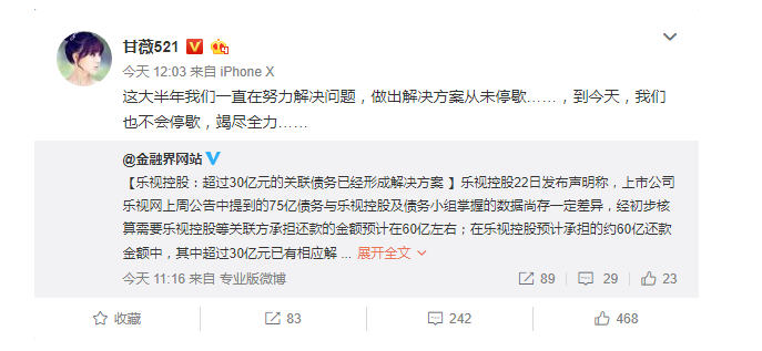 转载请标注:信息网——乐视控股澄清欠款60亿非75亿 贾跃亭妻子发声