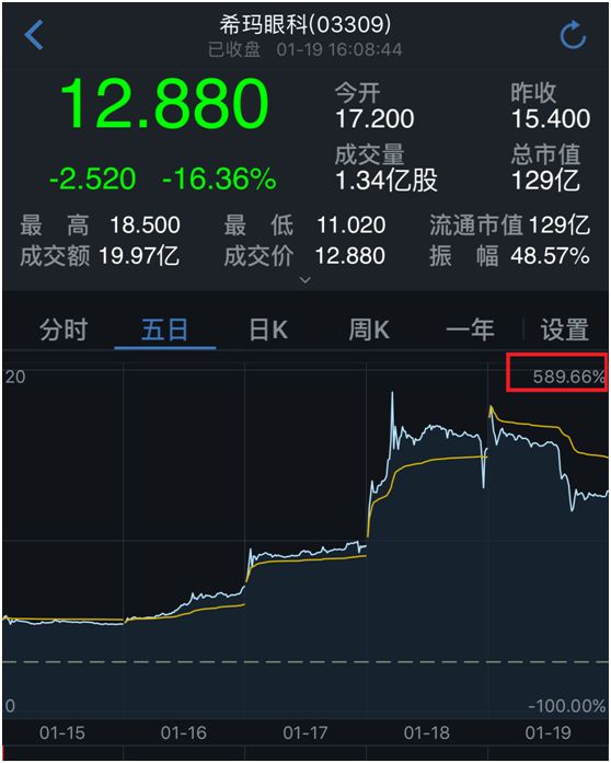 虽然今日午后涨势有所逆转,但希玛眼科从1月15日上市后的四个交易日内涨势惊人,昨日盘中价最高达到了19.9港元,涨幅达586%。