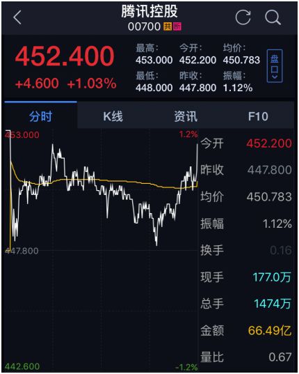 一天时间内身家暴涨5亿,得益于腾讯股价的上涨。今日港股收盘时,腾讯股价为452.4港元,较前一交易日447.8港元的收盘价上涨了4.6港元,涨幅为1.03%。