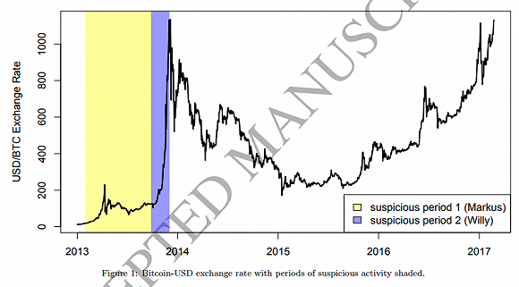 上述研究人员认为,当时比特币价格在两个月内从150美元飙升到1000美元,可能就是这些“可疑交易”操纵价格的结果。