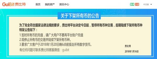 网络整理 2021-03-22 18:081月17日消息,数字资产交易平台贵比特日前对外发布公告称,为了完全符合国家法律法规的要求,决定今日起,暂停所有币种交易,后期陆续下架所有币种。同时,贵比特要求广大客户于2018年1月20日晚6点前提走所有数字货币。