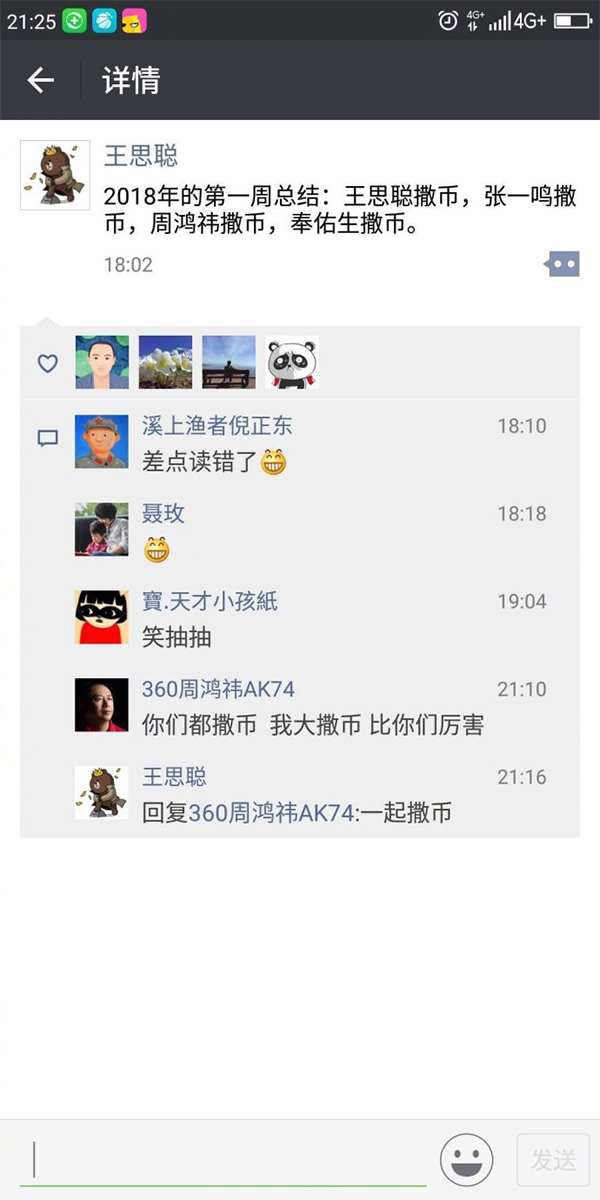 “2018年的第一周总结:王思聪撒币,张一鸣撒币,周鸿祎撒币,奉佑生撒币。”再早前的1月8日,王思聪朋友圈引爆“直播答题”。